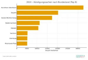 Nordrhein-Westfalen führt bundesweit bei Kündigungssachen, gefolgt von Bayern, Baden-Württemberg و Niedersachsen.